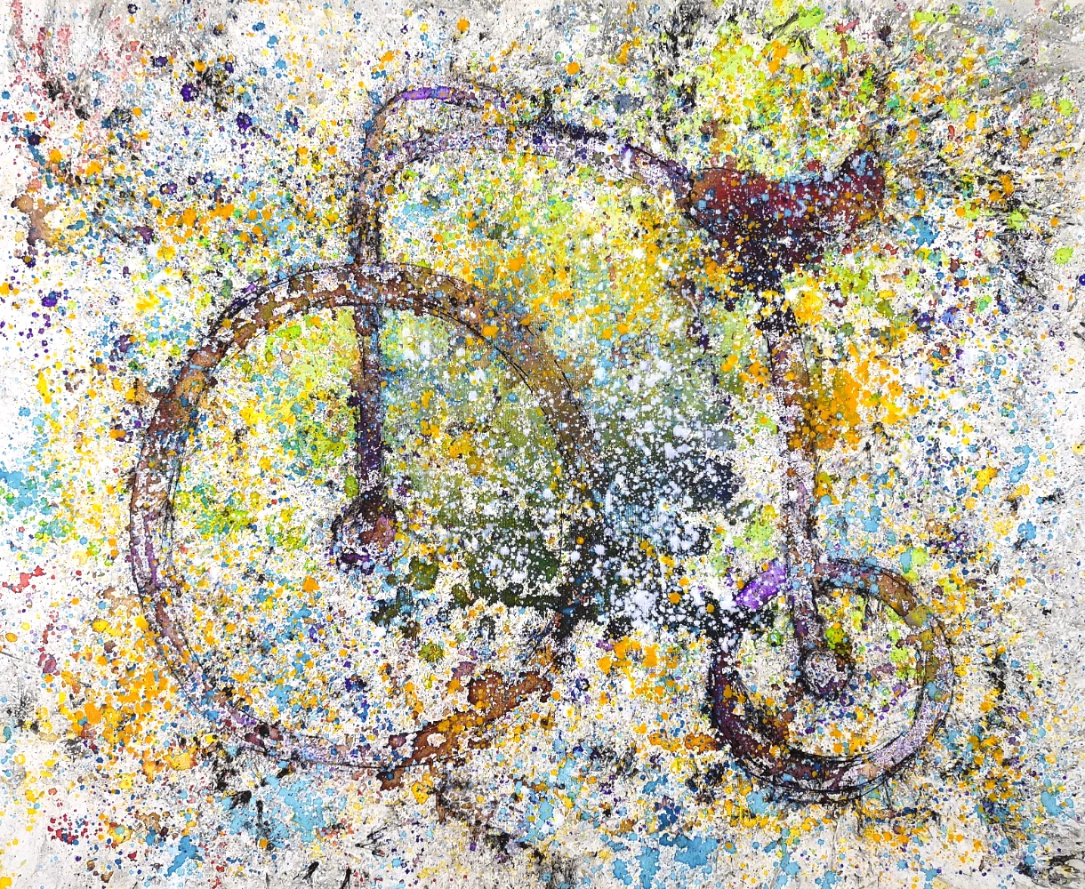 La obra titulada «Bicicle amb rodes liles» presenta una bicicleta estilizada con ruedas y manillar, predominantemente en tonos amarillos, azules y lilas, sobre un lienzo de dimensiones 80 × 100 × 4 cm. La técnica mixta utilizada distribuye puntos dispersos a lo largo de la superficie, lo que confiere a la pieza una notable sensación de dinamismo. Este cuadro se integra de manera destacada en ambientes modernos o minimalistas, aportando un toque de arte abstracto refinado a cualquier hogar. La realización de esta obra data del año 2019.