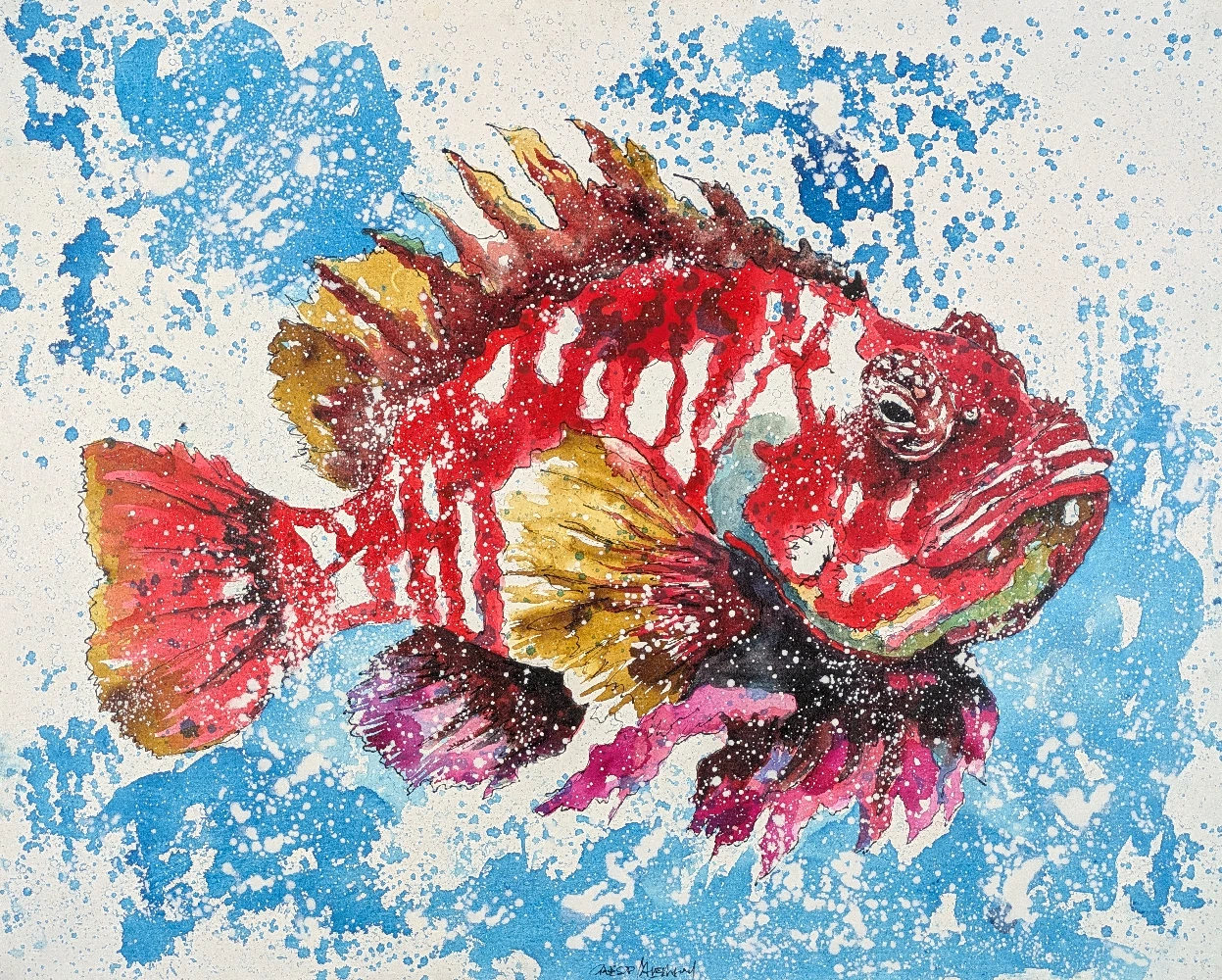 La obra titulada ‘Cap-roig IV’, ejecutada en el año 2025, es una pintura del ámbito contemporáneo que emplea técnica mixta para representar un pez de extraordinaria viveza cromática. La composición exhibe un pez cuyos tonos corporales se distribuyen entre el rojo y el blanco, con aletas que presentan una vibrante paleta que abarca amarillos, rosas y morados. El fondo en azul, adornado con audaces salpicaduras de color, evoca un entorno acuático de notable dinamismo y energía. Realizada sobre un lienzo de 80 x 100 x 4 cm, esta pieza sobresale por su capacidad expresiva y el audaz uso del color, logrando una impresión visual de gran intensidad que captura la atención del observador mediante la viveza y el detallismo del sujeto marino.