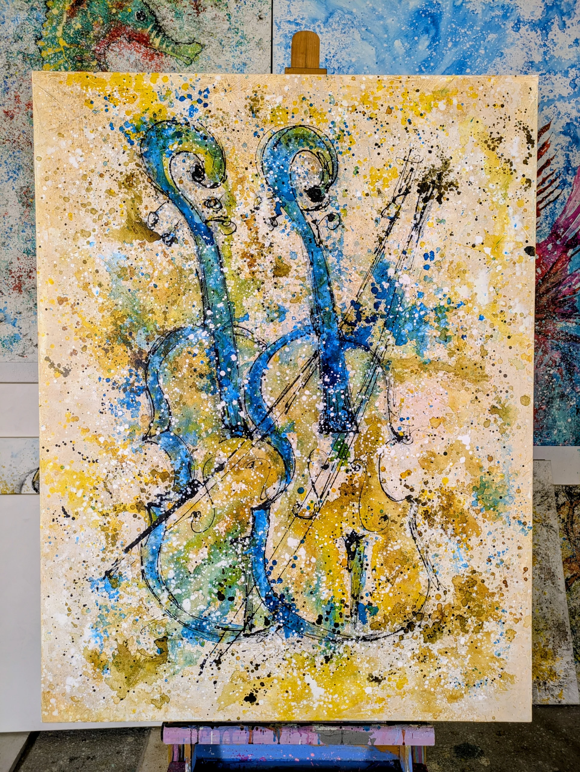 Aquí tienes una pieza que sin duda cautivará tus sentidos: dos violines vibrantes en tonos azules que destacan sobre un fondo luminoso de amarillos, azules y beige. Es un trabajo de técnica mixta sobre tela, pensado para ser disfrutado a partir de 2026. Perfecto para darle un toque especial a tu salón o sala de música. Sus medidas, 116 x 90 x 4 cm, garantizan que será el centro de atención en cualquier espacio.