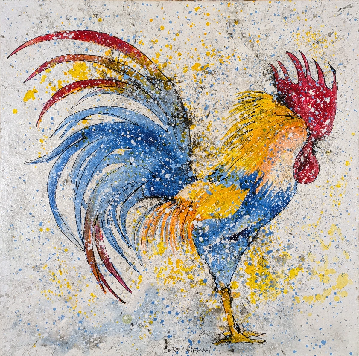 ‘Gall arlequí’ es un gallo lleno de vida y color. Imagina esta acuarela en tu pared: azules y rojos intensos, con toques de amarillo y naranja que le dan un aire dinámico. Las pinceladas sueltas y las salpicaduras dan un sentido de movimiento, casi puedes ver al gallo moverse. El fondo tiene manchas de colores que armonizan con el protagonista sin restarle fuerza. Este cuadro es pura energía y vitalidad, ideal si te gustan los estilos modernos y atrevidos.