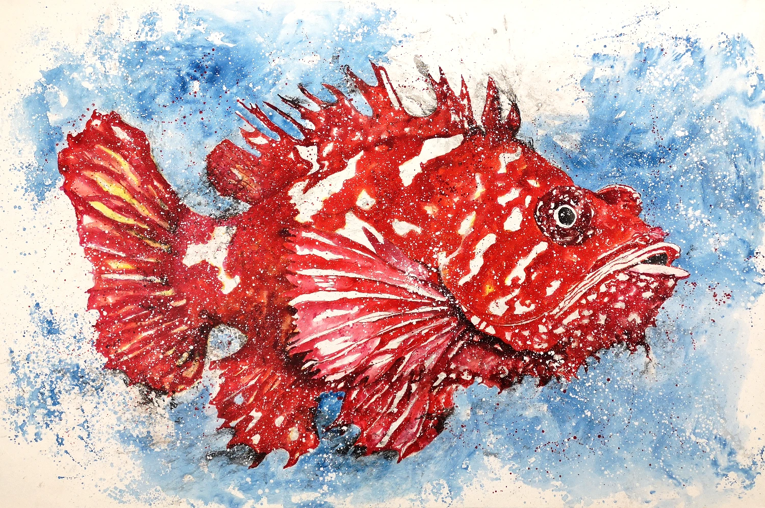 La obra titulada ‘La Danza del Pez Cabracho’ presenta la figura de un pez cabracho caracterizado por sus tonalidades rojas y blancas, capturado en pleno movimiento sobre un fondo azul. Esta pieza artística captura e ilustra la esencia dinámica y energética del océano, trasladando al espectador a un estado de contemplación de la vitalidad marina.