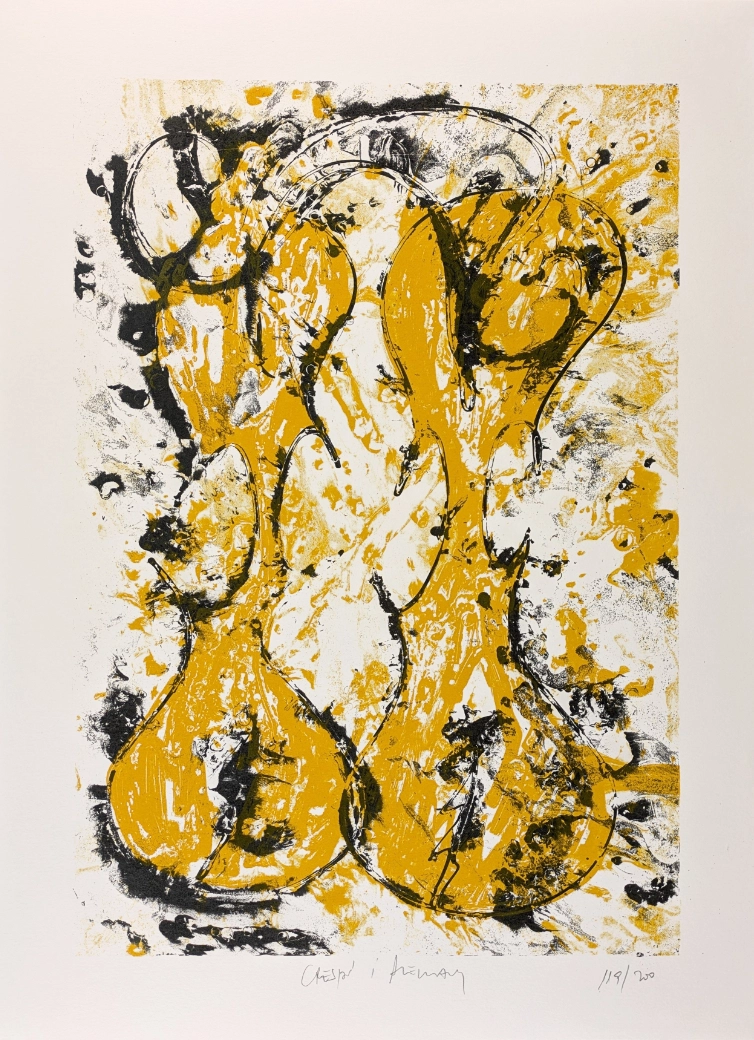 En Dos violines, el gesto pictórico y la energía del trazo construyen una imagen vibrante en la que el amarillo y el negro dialogan con intensidad. La composición sugiere movimiento, ritmo y tensión visual, evocando la presencia sonora de los instrumentos a través de un lenguaje plástico expresivo.